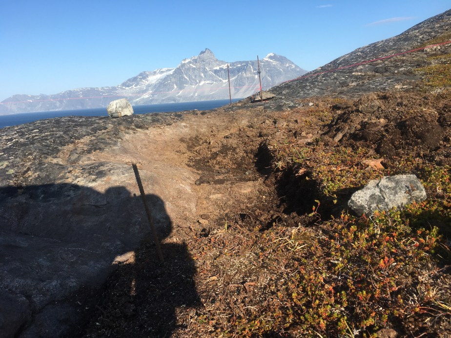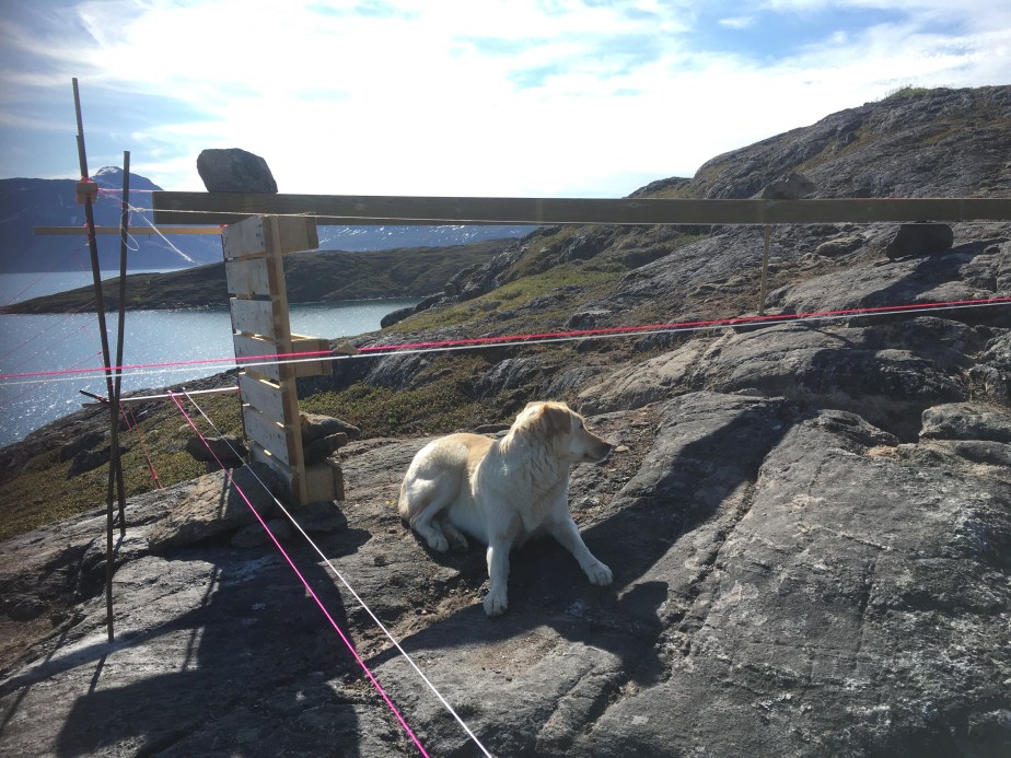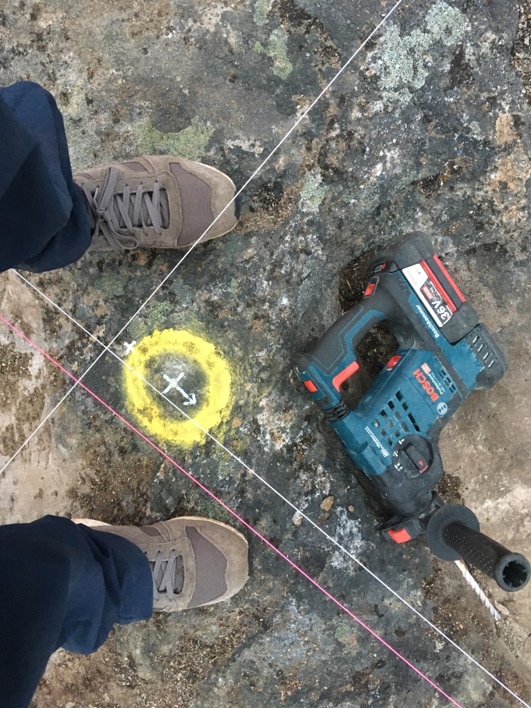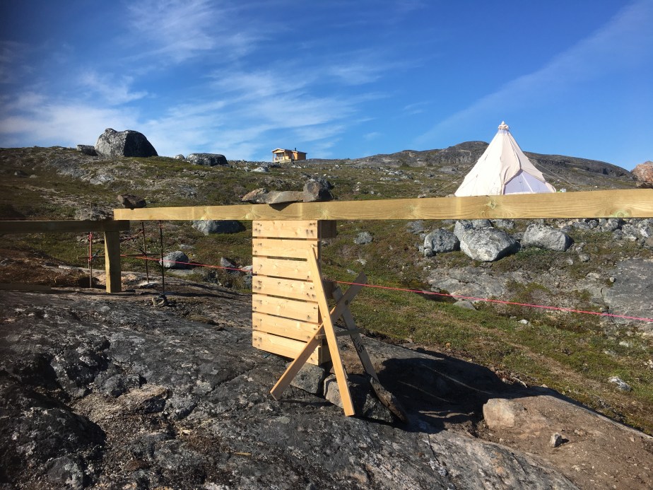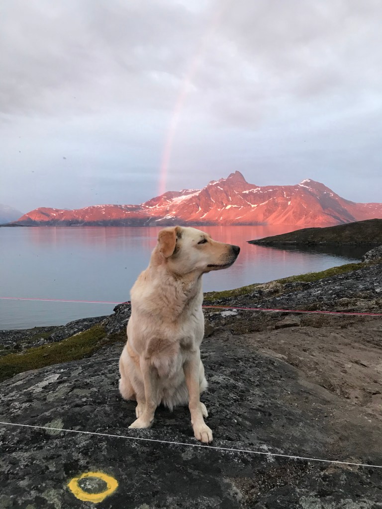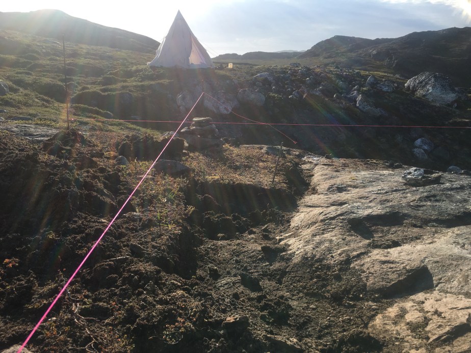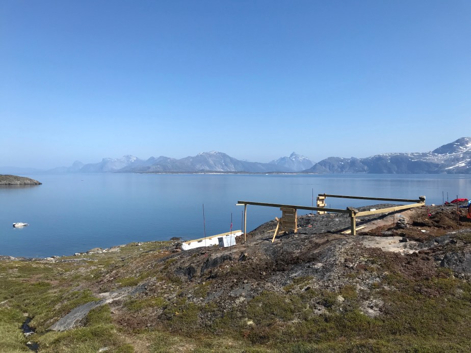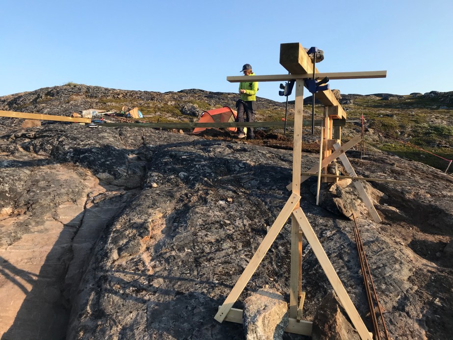 01/08/2021: Admiring the final marked drill points.28/07/2021: Disaster struck in the first day we arrived for this stint. We found bad rock beneath established vegetation, where we had planned to place the beam that forms the back wall of our cabin. The only solution was to move the string lines yet again and orientate the cabin footprint to avoid this patch of bedrock. So, our first task for this trip was to draw out version 3 of the string lines!28/07/2021: The bad bedrock from a different angle. We had to dig up a lot of soil to assess it. 29/07/2021: We got out the beams again to mark out the new footprint of the cabin, rotating and moving them forward (i.e. towards the water) from the previous position.29/07/2021: The cracking contraptions used to hold the beams up and keep them level. 01/08/2021: We used pallets to hold up the beams, stabilised with scrap pieces of wood. Rebar was drilled into the bedrock and used to attach the string lines. Unfortunately we began running out of wood and rebar, so had to make a pitstop back to Nuuk to get more. We luckily found some more at some of the construction sites in town, and could get back to the cabin site with plenty more materials. 01/08/2021: Another pallet holding up the opposite beam. The dog is lying where the cabin decking will be installed.01/08/2021: Batterboards were placed between the rebar so that the string lines could be adjusted if needed. The pink string line is for definiting edges, whereas the white string line denote centre lines.01/08/2021: The dog helping in the sun as we set up the string lines.01/08/2021: We used pythagoras’ theorem to measure the distance of the diagonals (i.e. the hypothenuse of a right angle triangle) to check that the strings lines were correct.01/08/2021: Once the string lines for the interior centre lines and cabin edges had been set up then we could start to remove the beams. It was a nerve-racking moment to remove to beams as they had been our guides. Once they were removed, we could set out the final centre lines and finish the string lines array. 01/08/2021: Once all the string lines had been finished, we could use a plumb line to identify the points to the drill which we marked with white chalk and yellow spray paint. We marked out 30 drill points, in a 6×5 array.01/08/2021: One of our drill points. We shifted this one slightly so that we could drill into better rock. Generally, the drill points can move up and down the position of the string line, but they cannot be moved laterally.01/08/2021: A beautiful sunset and a rainbow came out once we had finished marking out our drill points. It must be a sign!02/08/2021: Tucking our beams and equipment back under the tarps, ready for us to use them again when we return next time.